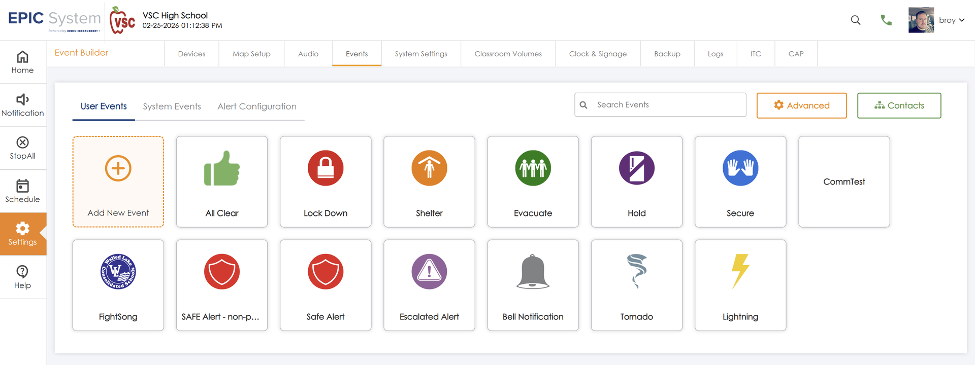 First navigate to the User Events by logging into your EPIC server and heading to Settings > Events. The page should look something like this.