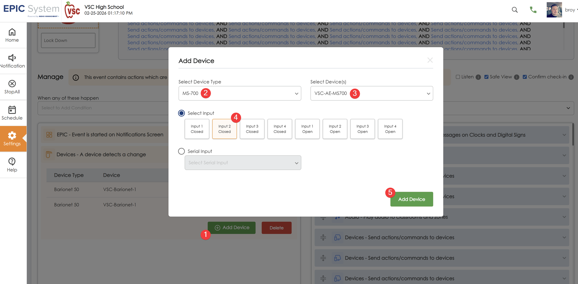 Now in that new item that populated as seen in the background of the above image (1) select + Add Device which will pop up the foreground window. Select the device type (2) and select which device the input is being detected on. (3)