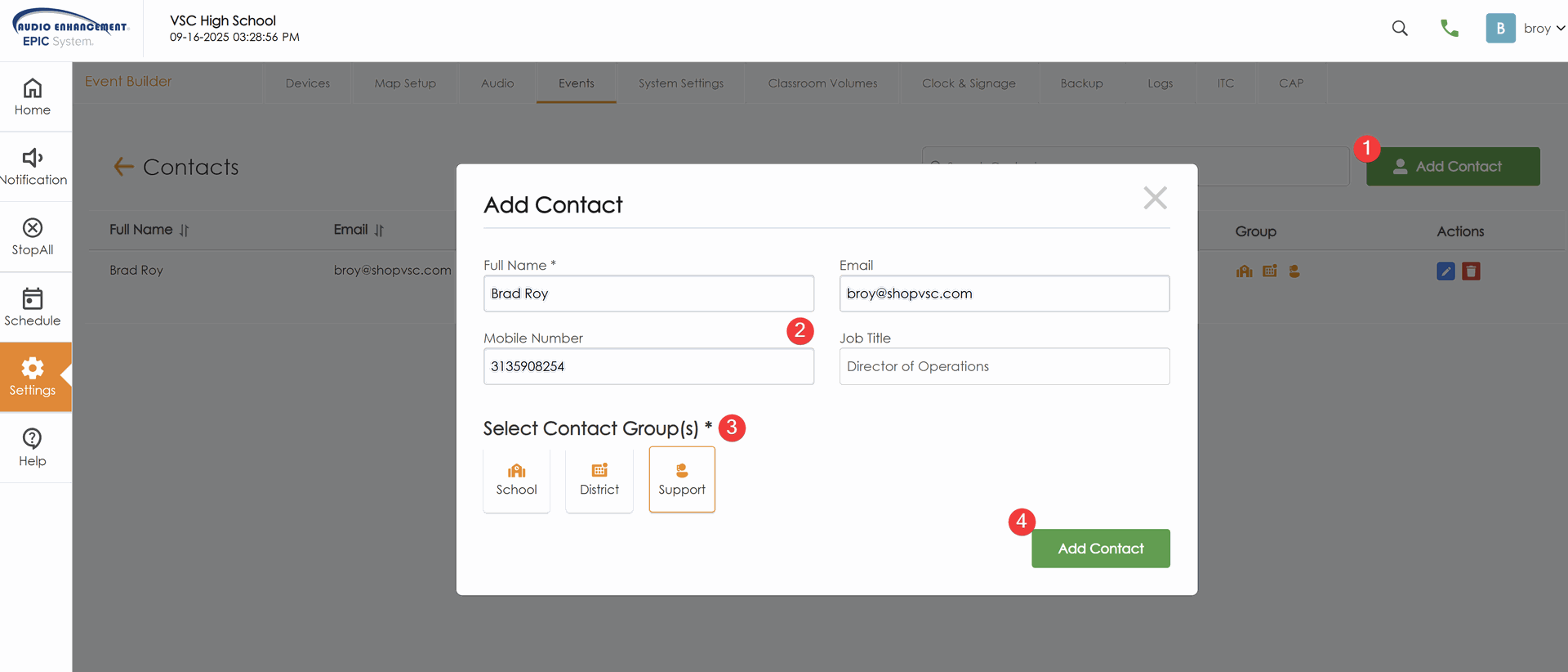 - Select the Contact Group they apply to. This will matter later. You will choose by this group what notifications you want sent to them. For example a SAFE Alert might go to a principal, but a Lockdown would go to the District Security Officer or Superintendent.